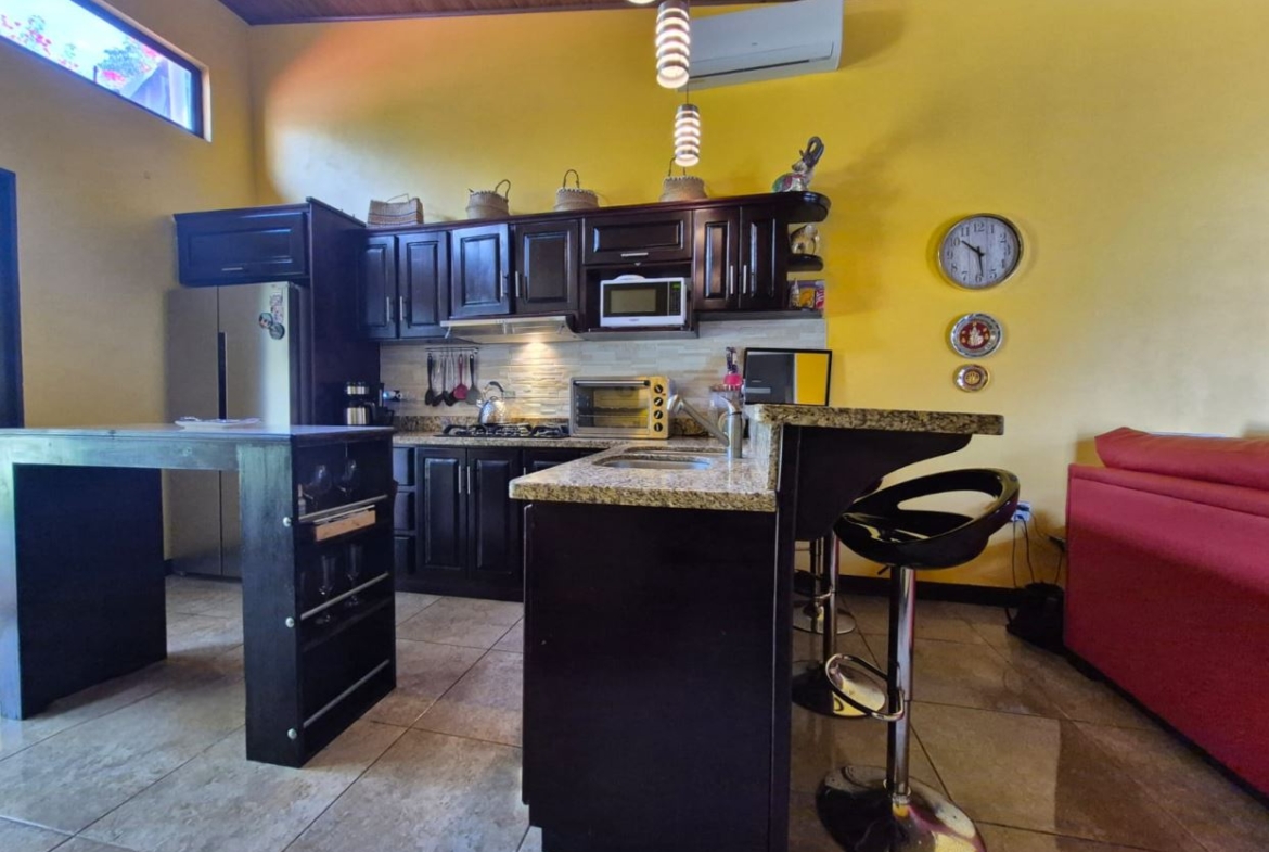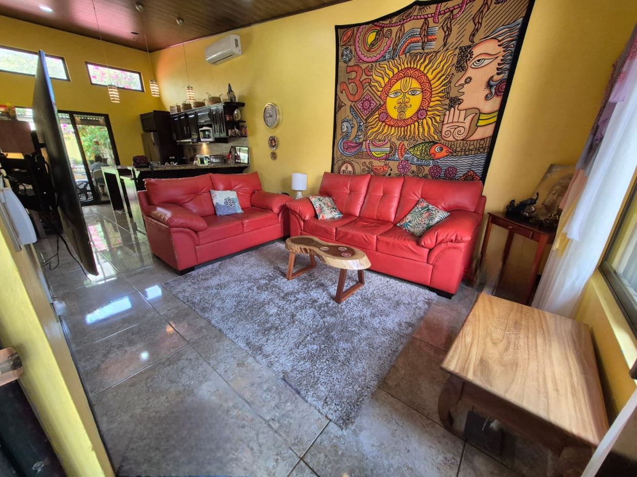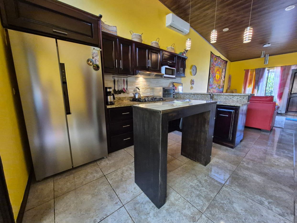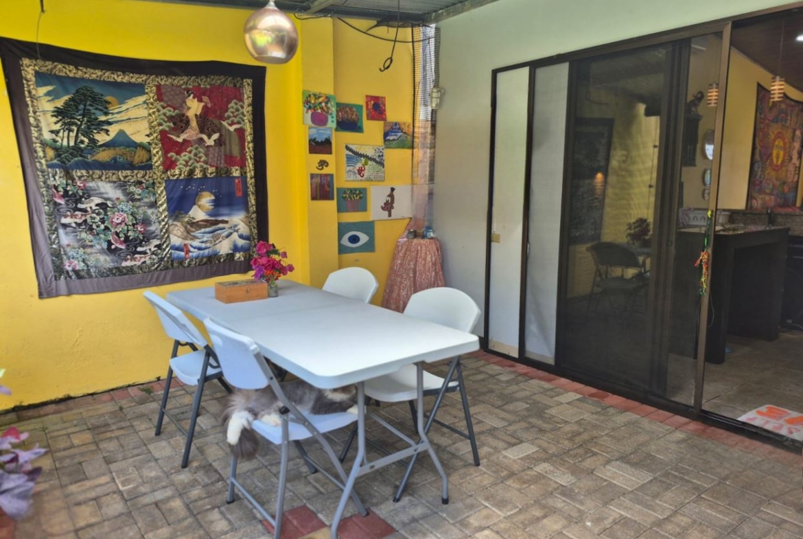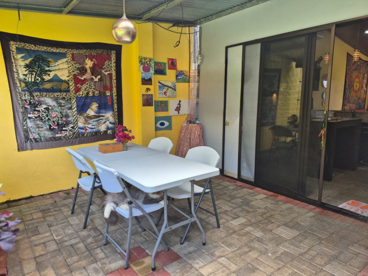 Nestled in the peaceful Halder Neighborhood of Daniel Flores, Pérez Zeledón, this charming home offers the perfect combination of privacy and convenience. With a lush forest preserve as its backyard, you’ll enjoy a serene setting while still being close to shopping centers like Walmart and public transportation. Inside, the house features an open-concept layout with high-ceilings that enhance the spacious feel and help maintain a pleasant indoor climate. The fully furnished interior includes a stylish kitchen with granite countertops, custom wood cabinetry, and modern stainless steel appliances. The inviting living area is tastefully decorated, with comfortable seating and large windows that fill the space with natural light. The master suite is a private retreat, boasting a walk-in closet and an en-suite bathroom. A covered terrace, currently used as a creative space for painting, overlooks a beautifully landscaped garden where butterflies flutter throughout the day.