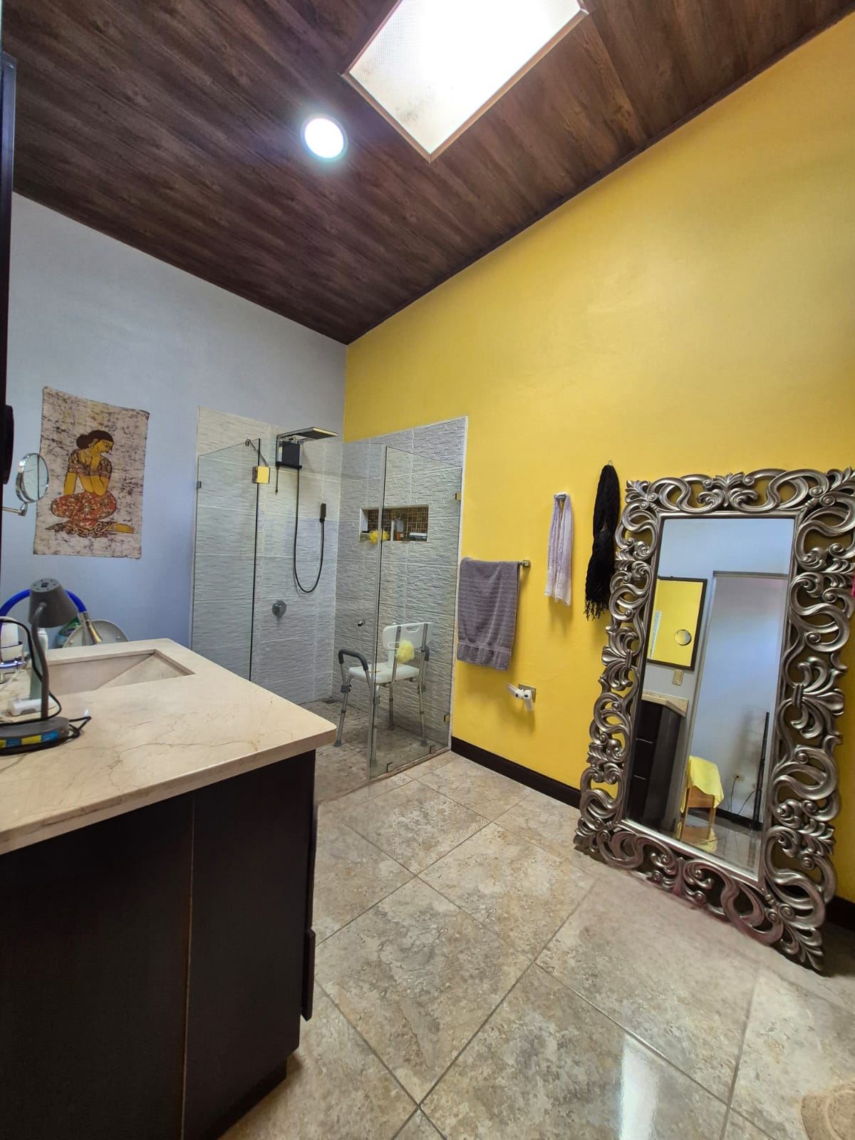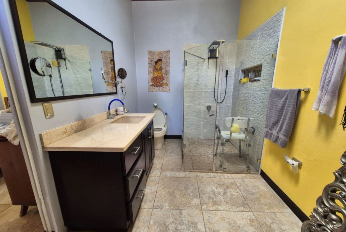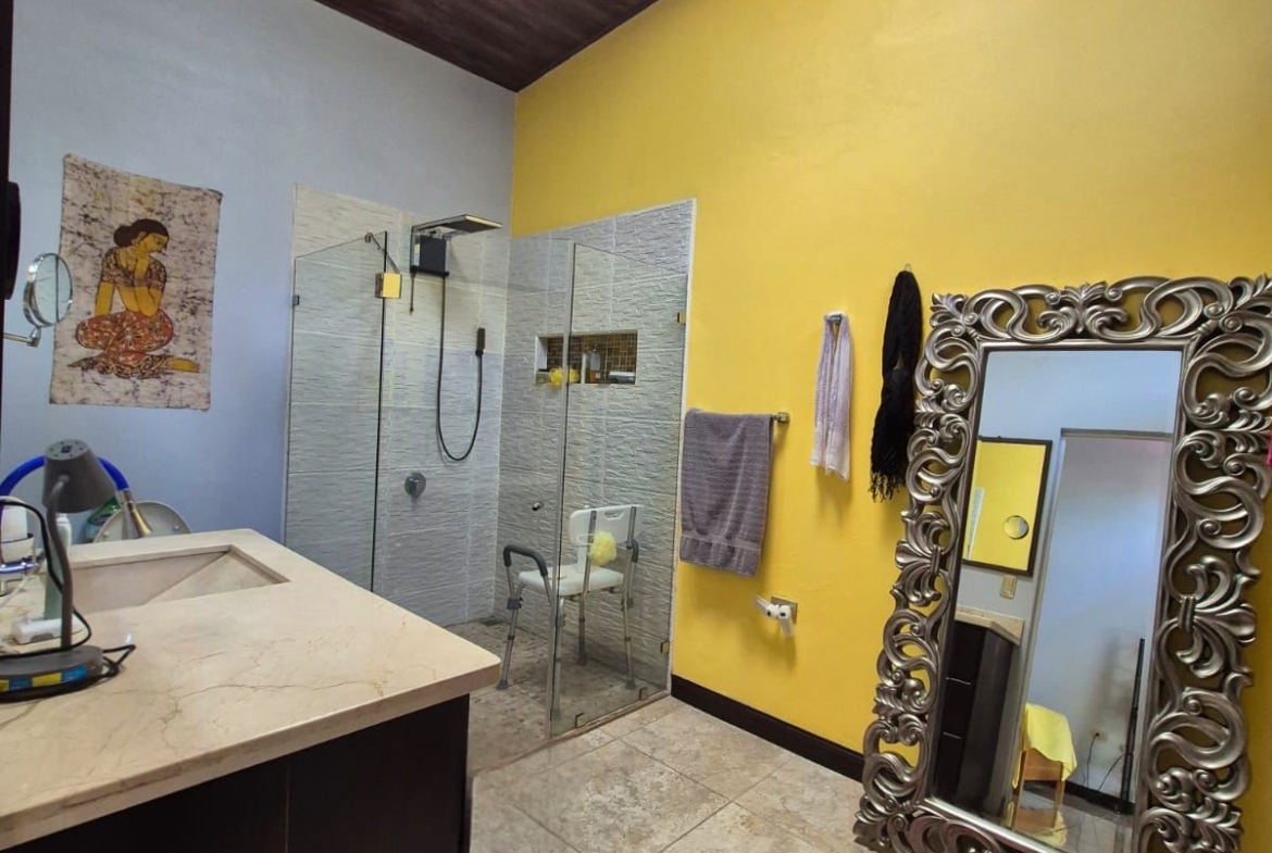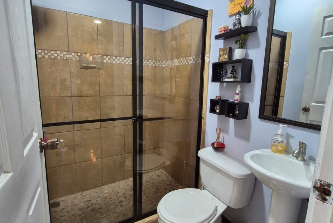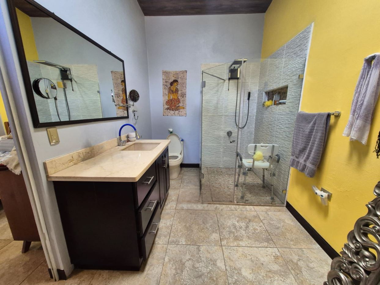 Nestled in the peaceful Halder Neighborhood of Daniel Flores, Pérez Zeledón, this charming home offers the perfect combination of privacy and convenience. With a lush forest preserve as its backyard, you’ll enjoy a serene setting while still being close to shopping centers like Walmart and public transportation. Inside, the house features an open-concept layout with high-ceilings that enhance the spacious feel and help maintain a pleasant indoor climate. The fully furnished interior includes a stylish kitchen with granite countertops, custom wood cabinetry, and modern stainless steel appliances. The inviting living area is tastefully decorated, with comfortable seating and large windows that fill the space with natural light. The master suite is a private retreat, boasting a walk-in closet and an en-suite bathroom. A covered terrace, currently used as a creative space for painting, overlooks a beautifully landscaped garden where butterflies flutter throughout the day.